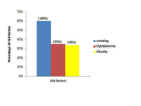 The classification of CAD risk factors into modifiable and non-modifiable is well established. Modifiable risk factors include obesity, diabetes, hypertension, sedentary life style, smoking, and hypercholesterolemia. Non-modifiable include gender, age, and family history. Which may occur alone or may intertwine leading to one another such as obesity leading to hypertension and diabetes. It is well known that,the more risk factors a patient has the higher the possibility of having CAD. One of the commonest worldwide would be Metabolic syndrome; a combination of hypertension, elevated insulin levels, high waist circumference, and high triglyceride levels, this can occur even in the younger age groups <45years and highly increases with age.5 This study was unique it focused on a young Saudi male patients group < 35-45years old. Due to modern lifestyles and easy accessibility in our countery, smoking has become common among the younger population. This might explain the high incidence (60%) of smoking as major risk factors in this age group.