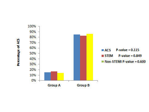 Hypertention in Group A was 20 patients (8%) vs Group B 233 patients (92%) and P-value was <0.001, (Figure 3). Diabetes Mellitus in Group A was 20 patients (7%) vs Group B 257 patients (93%) and P-value was <0.001, (Figure 3). Smoking in Group A was 84 patients (16%) vs Group B 446 patients (84%) and P-value was 0.680.