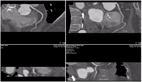 2D Transthoracic Echo showed regional wall motion abnormality in basal and mid inferior wall and inferior septum and basal posterolateral wall, moderate LV dysfunction, preserved RV function, mild MR, moderate circumcardiac pericardial effusion. Her blood analysis was unremarkable. In view of recent onset pericardial effusion post thrombolysis and tachycardia with persistent ST elevations a suspicion of cardiac rupture was entertained. The 2D Echo did not reveal any clue to the cause of pericardial effusion so an additional investigation was sought to clarify this suspicion. Coronary CTA was planned as it is rapid, noninvasive, gives information on coronary anatomy and most importantly with the cine sequences the rupture track is delineated and the contrast pooling in the pericardial space is diagnostic of rupture. Retrospective gated coronary CT scan was performed which revealed a sealed myocardial rupture in the basal posterolateral wall of theleft ventricle with a neck of 2mm and an area of 0.8cm2 (Figure 1). CT coronary angiogram showed total occlusion of a large OM2 branch with grade V thrombus (Figure 2). Coronary anatomy was clearly depicted despite her heart rate being above 100 beats per minute which was corroborated by the coronary angiogram which was done just prior to subjecting her for surgery.