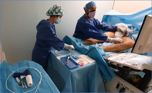 Figure 4 Eco-guided puncture of the saphenous axis. Nurse at the patient's bedside, with access to assist both the doctor, the ultrasound operator and the patient.