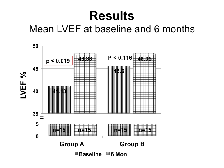Our preliminary results confirm those of previous studies12 showing the safety and feasibility of direct intramyocardial injection of ABBMCs which did not lead to myocardial damage or severe dysrhythmia. In fact, significant increase in the rate of occurrence of relevant post-operative adverse events in group B patients including post-operative bleeding, dysrhythmia, chest pain, pneumothorax with surgical emphysema…etc. No intra-operative nor perioperative cardiac deaths. Postoperatively, one mortality occurred with no apparent cardiac cause. Clearly, our most interesting finding was the unexpectedly low mortality when compared to the expected rate described for these patients. The expected yearly mortality rate in patients with NYHA functional class III or higher, ranges between 20 and 30%;11 in our study, 15 out of 15 patients in group A finished the 6-month follow up period of the study.