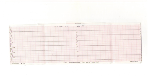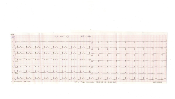 Figure 2 ECG 07.05.2013 00:54: sinus tachycardia which 101 per minute, with QS V1-V3, ST elevation in these leads, the voltage reduction R from V4-V6 and in the first standard lead.