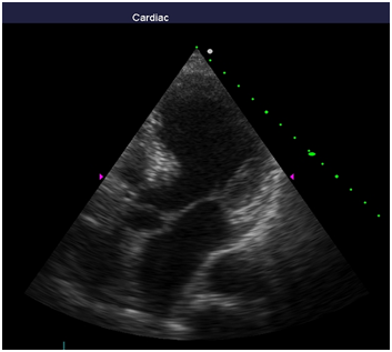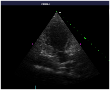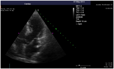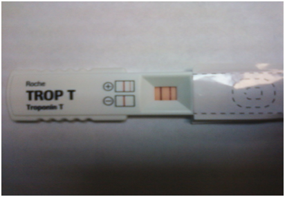 Repeated echocardiography revealed the zone of violation of local contractility (akinesis and pronounced hypokinesis) all segments on the medial and apical level with the formation of acute left ventricular aneurysm, a marked reduction of EF (23%), hyperkinesis all segments at the basal level (Figure 4-8). Troponin test was strongly positive (Figure 9). The patient is re-examined by a cardiologist, on the basis of ECG, Echo pattern, and the presence of markers of myocardial damage diagnosed with acute myocardial infarction in type 2 complicated by development of acute left ventricular aneurysm, acute heart failure Killip class IV. We carried out differential diagnosis between stress cardiomyopathy and myocarditis.