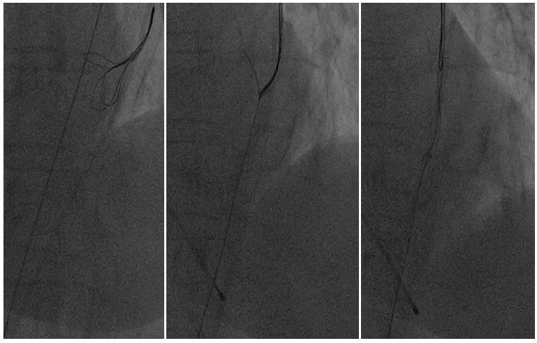 On physical examination she was symptomatic for dyspnea(NYHA class III). Midsystolic murmur was heard near midsternal border and pretibial edema was noted. Transthoracic echocardiography revealed dilatation of both atrium, left ventricular hypertropy, moderate mitral regurgitation, severe tricuspid regurgitation and sclerosis of aortic valve with mean gradient 54 mmhg and maximal gradient 90 mmhg. Aortic valve planimetric area was calculated as 0,6 cm2. Ef:64% with pulmonary hypertension(PAPs 48 mm hg). Coronary angiography showed noncritical stenosis of coronary arteries. The decision was to perform transcatheter aortic valve implantation with transfemoral approach. A transvenous temporary pacing wire was positioned in the right ventricle via the left femoral vein. Percutaneous right femoral acces was then obtained and 18 F delivery system was used. There were extreme calcification and tortuosity in femoral and iliac arteries (Figure 1 & 2). It was very difficult to advance the delivery system. Aggressive baloon angioplasty was performed with peripheral baloons but no further advancement of the 18F system was possible. A 25 mm Amplatz Gooseneck snare was advanced from brachial artery to snare and prolapse through the sheath. This procedure allow additional tension, thereby allowing easy passage of the valve delivery system (Figure 3-5). Baloon valvuloplasty was performed before device placement, after which a 0,035 Amplatz extra stiff guidewire placed in the left ventricle. 25 mm Direct Flow Medical valve is then advanced over a stiff guidewire and deployed within the aortic annulus. Prostar were used to close the vascular access site.