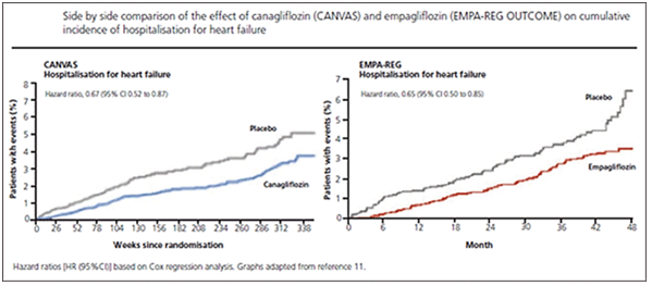 The exact mechanism as to why significant cardiovascular benefit was noted in these agents remains in question, but proposed theories include reduction in blood pressure, reduction in body weight, reduction in arterial stiffness, possible augmentation of myocardial function, diminution of oxygen demand, lack of sympathetic nerve activation, reduction in oxidative stress, increased glucagon secretion, reduction in circulating uric acid, effect on magnesium levels both intra-and extra-cellularly as well as increased levels of beta hydroxybutyrate, which is the main energy source utilized in myocardial contractility.26 There has been a tremendous amount of interest in the delay of progression of renal insufficiency in type 2 diabetic patients using SGLT2 receptor antagonist therapies that is noteworthy to mention. This preservation of renal function was noted in the EMPA-REG study, CANVAS-R study as well as a dedicated study looking at renal function involving the use of canagliflozin, the CREDENCE trial, which was stopped early on the basis of significant demonstrated benefit in those in the canagliflozin group. The exact mechanism is not very well understood, but appears to perhaps be related to reduction in inflammatory markers, such as TNFR1, IL-6, MMP7 and FN1. These very markers have also been suggestive of contributing towards development of intrarenal fibrosis.27
