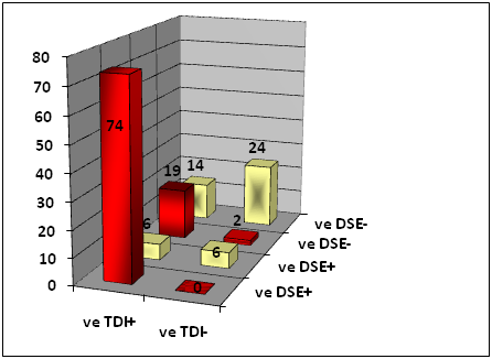 The most significant finding in this table was the improvement of 74 walls of 80 combined TDI& DSE positive walls, making a sensitivity of 90.2%, similarly 24 of 27 concordant TDI & DSE negative walls did not improve, making a specificity of 92.3%.