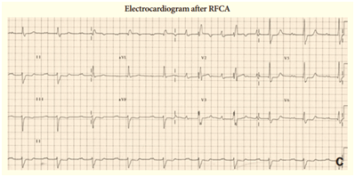 A 59year-old Fars male presented to our Emergency Department of Sayyad Shirazi Hospital, Golestan University of Medical Sciences, Northern Iran, with complaints of retrosternal chest pain and diaphoresis. He was a known case of systemic essential hypertension diabetes mellitus. Patient had not been received any treatment while presentation. His blood pressure detected as 163/91mmHg with pulse rate of 42/minute. Atropine was injected then he was immediately transferred to Coronary Care Unit (CCU). With more examination in CCU, his blood pressure was detected as 160/90mmHg, with pulse rate of 73/minute and cardiac auscultation revealed no significant finding; all other examinations were unremarkable. Patient’s first electrocardiogram showed heart rate of 78/min, PR interval of 253milli-sec, and QRS duration of 144milli-sec with mean QRS axis which was 264°. ECG showed as trifascicular block i.e. first degree atrioventricular (AV) block, right bundle branch block (RBBB), left anterior fascicular block (LAFB). His random blood sugar was 351mg/dl. He had experienced two episodes of Stokes Adams attack following which isoprenaline drip was initiated. Management of acute coronary syndrome begined for him as well. ABG reported metabolic acidosis with compensatory respiratory alkalosis and hyperkalemia (pH 7.35, pCO2 19.2 mmHg, bicarbonate 10.7mmol/L, S. Na+ 132mmol/L and S. K+ 7.3mmol/L). Laboratory results showed leukocyte count of 15300/mm3, hemoglobin of 6.1g/dl, with hematocrit of 21.4%. His serum creatinine was 4mg/ml with blood urea of 95.8mg/dl. Anti-hyperkalemic measures (including calcium gluconate, kayexalate, and insulin and albuterol nebulization) were immediately launched and our patient underwent urgent hemodialysis; packed cell was transfused carefully. On the second day, hyperkalemia and acidosis were improved (S. K+ 4.1mmol/L, pH: 7.52, pCO2: 37.4mm of Hg, HCO3: 28.8mmol/L). His ECG on the second day indicated the heart rate of 85/min, PR interval of 136 millisec, and QRS duration of 103 millisec with mean QRS axis -52.5°. His ECG (Figure 1A) was diagnosed as LAFB; so AV block- first degree- and RBBB were improved after correction of hyperkalemia. CPK-MB and Troponin-I were measured to rule out coronary artery disease (CAD); CPK-MB was 1.3IU/L and Troponin-I was 0.1ng/ml. His 24hour Holter-monitoring showed ventricular pause up to 17seconds during syncopeepisodes (Figure 2B). At the time, a temporary pacemaker was implanted. Radiofrequency catheter ablation (RFCA) with bidirectional cavo-tricuspid isthmus block of atrial flutter was done. After RFCA, the ECG showed marked first-degree AV block and bifascicular block (RBBB and LAFB) and (Figure 1C); the 24hour Holter specified an alternating second-degree AV heart block. Owing to frequent episodes of symptomatic high-degree AV block, permanent DDD type of pacemakerwas implanted for him (Figure 1D). His siblings’ ECGs presented trifascicular block and their pedigree indicated an inheritance of autosomal dominance as well. Two-Dimentional echocardiography was unremarkable with LVEF 62%. He was discharged after 5days of admission.