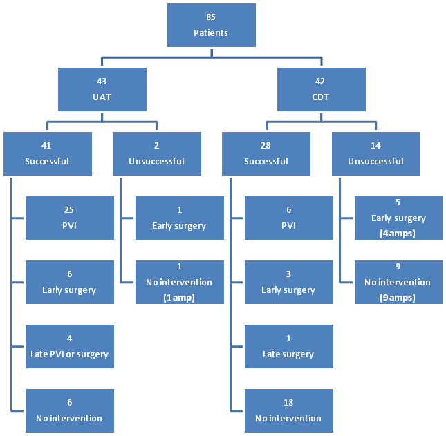 In the UAT group there was a 95.3% success rate, versus a 66.7% success rate in the CDT group (P=.0019) (Figure 1). 25/43 patients in the UAT group underwent additional endovascular intervention with either balloon angioplasty alone or in combination with stent placement. In the CDT group, only six patients underwent additional endovascular intervention. Of the UAT patients who were successfully lysed, six underwent revision of a bypass or other open revascularization during the same admission, three patients underwent revision within 6 months, while one patient required a late percutaneous intervention to maintain patency. In the CDT group, three patients underwent in-hospital operative intervention following successful lysis, while one patient went on to have surgical intervention within 6 months.