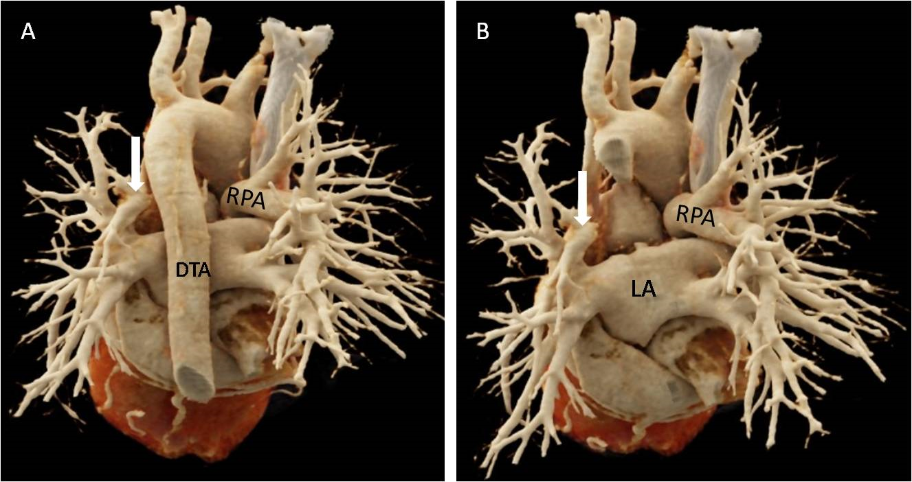 Figure 2 (A) and (B) Volume rendered CT images showing normal right pulmonary artery (RPA) with atresia of left pulmonary artery (LPA) and its hilar reformation (marked by white arrow). DTA-descending thoracic aorta, LA-left atrium.