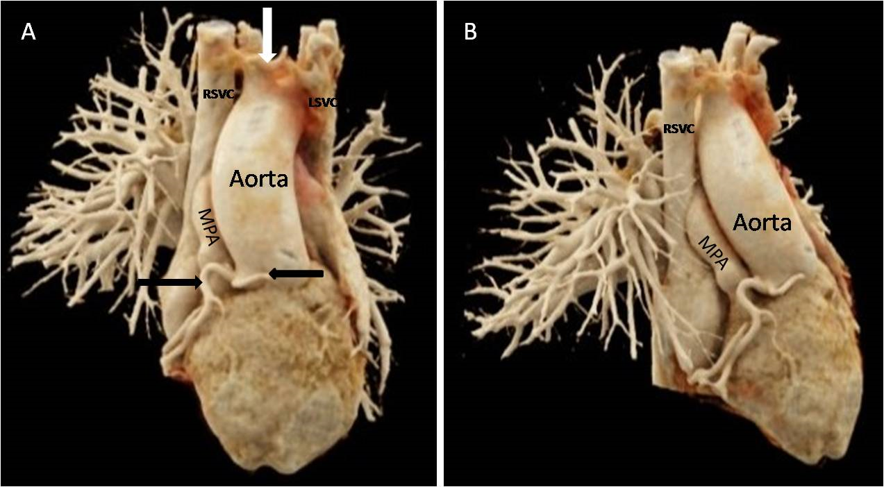 Figure 4 (A) and (B) Volume rendered CT images showing double superior vena cava (SVC) with intervening connecting vein (marked by white arrow), origin of main pulmonary artery (MPA)and aorta from right ventricle with common origin of right coronary artery and left anterior descending artery (marked by black arrows).