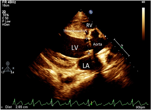 A 24 yrs old pleasant gentleman presented with history of gradually progressive shortness of breath and palpitation on exertion of 5 months duration. He also had history of 2 syncope 6 months prior. On examination he had wide pulse pressure with presence of peripheral aortic run off. Cardiac examination revealed displaced cardiac apex laterally with hyperdynamic apex beat, grade III early diastolic murmur over the aortic area. Rest of the examination was normal. Electrocardiogram revealed LBBB with first degree Atrio-Ventricular block with occasional ventricular premature beats. Chest X-Ray showed prominent bronchovascular markings. 2D echocardiogram revealed aneurysmal dilatation of right sinus of valsalva (SOV) which was burrowing and dissecting into interventricular septum (IVS) – echo free space as shown in Figure 1. LV was dilated with LVEDD of 5.4 cm and LVESD of 4.0 cm and reduced LV function (LVEF 40%). Aortic annulus was dilated (3 cm) and ascending aorta was of normal size. Aortic valve was tricuspid but deformed and calcified with evidence of severe aortic regurgitation. There was no communication of right sinus of Valsalva with any of the chambers. RA and RV were of normal size. TEE revealed same findings as in 2D echo, but both the right and left sinus of valsalva were seen dilated with the right coronary cusp (RCC) seen dissecting into the IVS with a nodular calcification in the vicinity of AoV as shown in Figure 2. Aortogram findings were also compatible with the 2D echo and TEE findings, which showed dilated right SOV without any evidence of leak into any of the chambers. Thereafter patient was taken up for aortic valve replacement along with repair and closure of the right sinus of valsalva aneurysm with Dacron patch. Intraoperatively there was a dilated right SOV with a cavity which led to the dissected IVS. The cavity was filled with calcium deposits and mural clots. The aortic side of the aneurysm was closed with Dacron patch, preserving the conduction system and avoiding the right coronary ostium. Post operative echo after 3 months showed completely healed and thrombosed aneurysmal sac of right SOV within the IVS as shown in Figure 3. There was no LV dilation (5 cms) with normal LV functions with normal functioning of the aortic prosthesis.