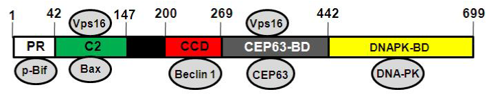 Figure 1 Schematic representation of domains of human UVRAG. The proline-rich (PR) domain binds phosphorylated Bif. The C2 domain associates with Bax. The Coiled-coil domain (CCD) interacts with Beclin 1, the CEP63 binding domain (CEP63-BD) with CEP63, the DNAPK binding domain with DNA-dependent protein kinase (DNA-PK). The C2 domain and the region harboring CEP63-BD (amino acids 269-442) cooperate to bind Vps16.