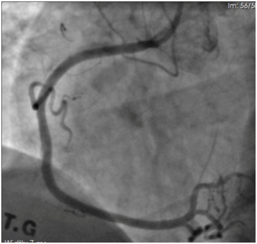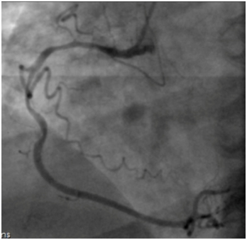 A 57-year-old man presented with stable angina grade III was admitted to hospital for elective percutaneous coronary intervention (PCI) for right coronary artery (RCA). From cardiovascular risk factors patient have non-insulin depended diabetes, arterial hypertension, dyslipidemia and previous PCI. Echocardiography revealed normal left ventricle function with no signs of valve dysfunction.