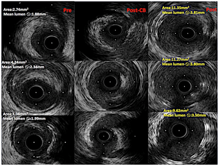Figure 2 IVUS cross-sectional images from pre-intervention (first colon from left), after plaque modification with cutting balloon (middle colon), after scaffold implantation (left side colon). In middle colon can seen vessel lumen dissections, made by cutting balloon. Lumen changes in diameters can be seen from left to right colons.
