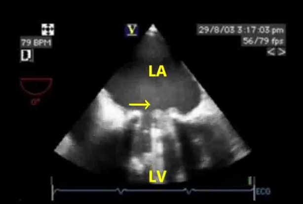 Video 1 Two-dimensional transesophageal echocardiography showing a rabbit like image, obtained from midesophageal transverse plane (0 degrees) (LA: Left atrium, LV: Left ventricle).