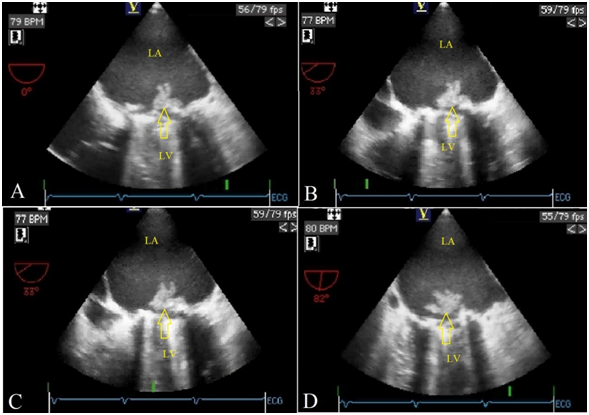 A 48-year old man was consulted to cardiology for 39°C fever and ongoing dyspnea for 2 days during his hospitalization in the intensive care unit. He had undergone mechanical mitral valve replacement 3 years earlier. His history included a dental procedure without antibiotic prophylaxis 15 days ago. The chest radiogram was unremarkable. Transthorasic echocardiography revealed a mass on the mechanical mitral prosthesis and increased transvalvuler gradients with decreased valve area. Subsequently, transesophageal echocardiography (TEE) was performed which showed a large obstructive mass on the prosthetic valve, protruding into the left ventricular cavity during diastole. It was observed that, the cross sectional images of the mass was resembling various animal shapes in different multiplane TEE views