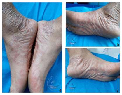 Figure 2 a,b,c Multiple erythematous-squamous plaques and papules, infiltrated in some areas, on the sole and dorsal part of both feet.