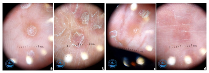 Figure 3 a. Fine circular scaling around the lesions, defining Biett's collar, with dark erythema in the center that attenuated toward the periphery. b. diffuse scaling in some areas. c. orange background. d. spotty vascular pattern.