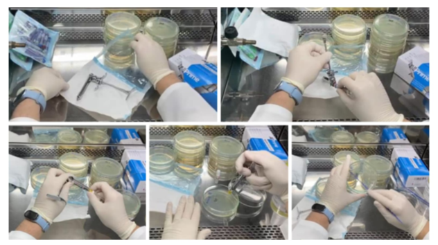 In order to collect the internal material, a step-by-step simulation of the dental procedure was performed with each medication tube. The tubes were inserted into the sterile carpule syringe and the needle was attached. Wearing gloves, five drops of the tube's contents were added to Nutrient Agar plates inside a laminar flow cabinet after sanitizing the tube's surface with 70% alcohol. The contents were streaked with the aid of a sterile loop (Figure 3).