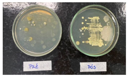 The tube was initially sanitized and rolled over the surface of the culture medium using sterile gloves. The tube was then handed to the student, who used it during the clinic. At the end of the consultation, the tube was rolled over the culture medium again to check for contamination. Subsequently, the two plates were kept in an incubator (aerobiosis) for 48 hours at 37°C.