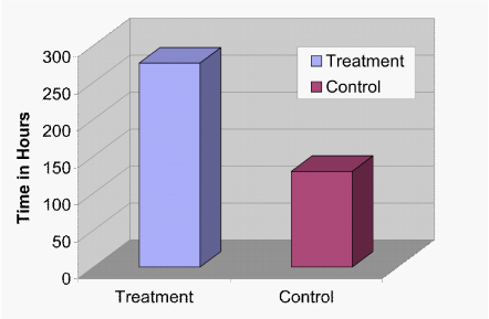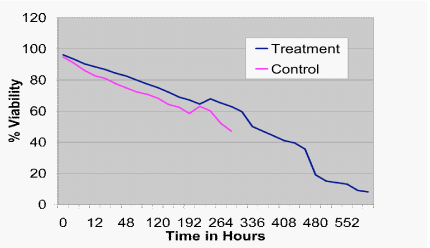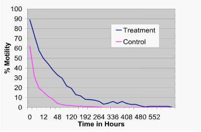 It was possible to determine the time it took for all samples to reach 0% motility. While the average time to zero percent motility for the control group was 129.6hours (std. error+/-30.75) with a range of 12 to 288hours, the average time to zero percent motility for the treatment group was 276 hours (std. error+/-49.74) with a range of 48 to 600hours. This represents a 378% increase in spermatozoa survival time in the treatment group over the control (Figure 2; P<.001).