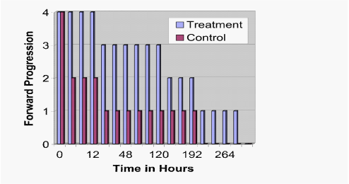These findings were confirmed by live/dead staining for viability, which demonstrated greater cell survival in the treatment versus the control at all time-points (Figure 3; P<.001). Further, using a five point scale, forward progression was significantly higher in the treatment group as compared to the control from the one hour observation point until the end of the experiment (Figure 4; P<.001).