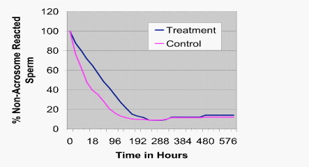 Finally, on average, it took less than eighteen hours for half of the cells in the control group to undergo the acrosome reaction as determined by fluorescent staining. By contrast, it took approximately sixty hours for half of the cells in the treatment group to stain as acrosome reacted (Figure 5; P<.02).