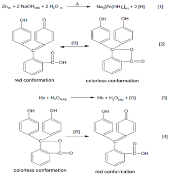 A solution of sodium hydroxide (2g of NaOH added to 9ml of distilled water) was added and 100mg of phenolphthalein dissolved in 1 ml of ethanol was added, then 2g of metal zinc powder was added to the solution and subjected to a sheet of heating at 80ºC under constant stirring until the coloration disappears. As a precaution, 3 days of rest were recommended so that the intensity of the color disappeared completely.13