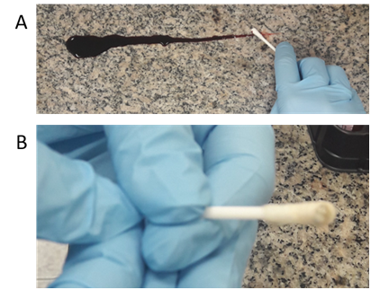 After the preparation of the Kastle-Meyer reagent and the three day wait the tests were started. First, the specificity test was performed to verify that the reagent would be able to identify blood from the different species. To demonstrate this result, photos of the swab were taken after addition of blood, water and the reagent as shown in Figures 2, 3 & 4 below.