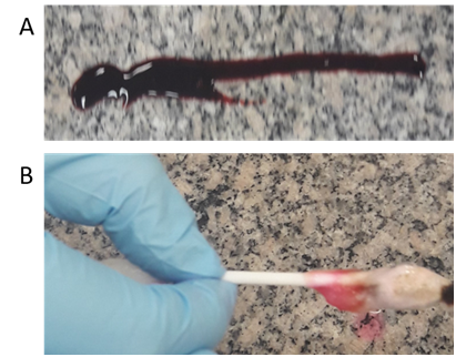 The vestigiality test showed that when blood of a human is cleansed with the above-mentioned different products shown in the images by the red circle, the Kastle-Meyer reagent is still able to identify the presence of blood by changing the color of the swab from colorless to pink. When canine blood is used for the experiment, a change in the color of the swab after surface cleaning and cleaning with the different products is evident, evidencing the effectiveness of the Kastle-Meyer test to identify the presence of occult blood. In the case of feline blood, it was observed after cleaning the surface and subsequent application of the test, that the result was positive for blood, and more clearly than when compared to the human and dog bloods previously demonstrated.