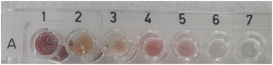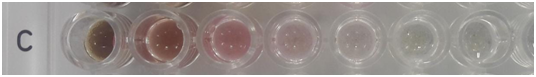 As can be observed, the three species tested showed a positive result after contact with whole blood, Kastle-Meyer reagent and distilled water. Then, a 96-well plate was used to perform the sensitivity test on each species. To this end, whole blood was added to the different lines of the first column of the plate and in the following distilled water was added to serially dilute the blood of the different species in 1:10, 1: 100, 1: 1,000, 1: 10,000 , 1: 100,000 and 1: 1,000,000. The result is shown in Figures 5, 6 & 7 below.