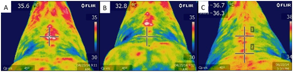 For the thermographic evaluations, the animals were kept in their own bays, exposed to normal conditions of rest and protected from sunlight or rain. The thermographic images were obtained with the thermographic apparatus (Flir® model E49001 / E40) positioned at a vertical distance of one and a half metres from the dorsal plane of the animals. All evaluations were performed in the same position. To obtain the data, the point temperature of the pathological focus, which was previously diagnosed, was measured three times, obtaining the initial mean temperature (ΔTi) (Figure 1A). At the same time, the measurement of the mean temperature of the contralateral region and lesion-free region was performed. The mean temperature of this region (ΔTc) was used as self-control (Figure 1B). This methodology was repeated until the tenth session, as shown in Figure 1C. In this way, we neutralized the influence of the variation of the ambient temperature in the evaluated moments, since the possible effects of the external environment were equal for both foci. After obtaining these data, the thermal differential (ΔT: ΔTi - ΔTc) was calculated, i.e., the temperature difference between the mean of the lesion focus (ΔTi) and the mean of the self-control focus (ΔTc). The ΔT was considered the final data to be evaluated. This methodology was similar to that performed by Um et al.12