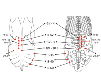 The weekly treatment with acupuncture was started after stage I. The thermographic evaluations followed the same methodology mentioned above and were performed once a week, for a total of six evaluations (M0, M1, M2, M4, M5 and M10). The selection of acupuncture points was based on the technique Lun Huan Chiao Ti F a,13 and the acupuncture needles were held at the points for 20 min. This technique, often referred as "surrounding the dragon," involves circling an area using points around the perimeter of the lesion; this includes points on the meridian of the bladder and vessel governor. Other points, considered as master and special points related to spinal injuries were used. These were: B-40, B-60, GV-20, E-36, VB-27, B-23, GV-3, GV-4, B-52 and Hua Tuo Jia Ji (Table 1) and (Figure 2).