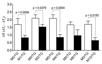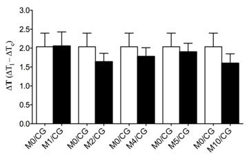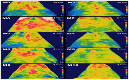 M0, initial time, before treatment; M1, time after 1 week; M2, after 2 weeks; M4, after 4 weeks; M5, after 5 weeks; M10, after 10 weeks; M0-M, temperature gradient (°C) between the initial time and after weekly evaluations