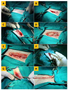 Figure 1 Plate showing the operative technique of laparotomy in the rabbit. (A) Placement of towels and clamps. (B) Incision of the skin, with dissected subcutaneous tissue. (C) Incision of the linea alba before peritoneal penetration. (D) Exploration of abdominal viscera after peritoneal penetration. (E) Suturing of the abdominal muscles with four cruciate mattress sutures. (F) Suturing of the subcutaneous tissue. (G) Insertion of the needle in the dermis for placement of the initial buried suture in BCSID closure. (H) Burial of the end suture after apposition of the skin edges prior to cutting off the suture thread in BCSID closure.