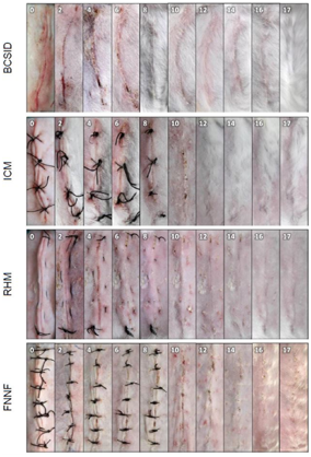 Figure 3 Representative plates showing the gross changes of successful wound healing for each suture pattern on different postoperative days (PODs 0, 2, 4, 6, 8, 10, 12, 14, 16 and 17). BCSID: buried continuous subcuticular intradermal, ICM: interrupted cruciate mattress, RHM: running horizontal mattress, FNNF: far–near–near–far. Numbers positioned in the cranial direction of the incision are referring to the postoperative day.