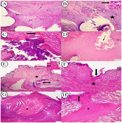 Figure 6 (A) Photomicrograph of rabbit skin with BCSID suture pattern on POD 17 showing mature connective tissue infiltrated with mild hemorrhage (arrow) and neovascularization (notched arrow); (B) Photomicrograph of rabbit skin with BCSID suture pattern on POD 10 showing connective tissue infiltrated with chronic inflammatory cells around the suture tract (star), presence of multinucleated giant cells around the suture material (arrow); (C) Photomicrograph of rabbit skin with ICM suture pattern on POD 17 showing pus formation (arrow), and mild hemorrhage in the dermis (notched arrow); (D) Photomicrograph of rabbit skin with ICM suture pattern on POD 10 showing beginning of granulation tissue formation at the base of the wound (arrow); (E) Photomicrograph of rabbit skin with RHM suture pattern on POD 10 showing immature connective tissue (star) with infiltration of acute inflammatory cells around the wound edges (notched arrow) and the epidermis underwent hyperkeratosis (down arrow) with scab formation (right arrow); (F) Photomicrograph of rabbit skin with RHM suture pattern on POD 17 showing complete healing of wound gap with complete reepithelialization (arrow), and granulation tissue formation (star); (G) Photomicrograph of rabbit skin with FNNF suture pattern on POD 10 showing complete healing with granulation tissue formation (star); (H) Photomicrograph of rabbit skin with FNNF suture pattern on POD 17 showing complete granulation tissue formation filling the entire wound gap with mature fibroblast cells (star) and reepithelialization (arrow). H&E stain. Bar=100μm.