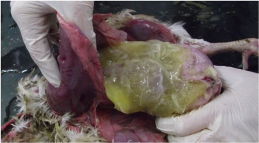 Post-mortem diagnosis is very common. Dead birds generally we find lying down on her back. Leather is finished with blue blue (cyanotic). By opening the thorax-the abdominal cavity is observed a large amount of fluid with or without fibrin clot (Figure 1). The amount of accumulated liquid may be from 100 to 300ml. The fluid accumulates in the pericardium (hydroperikard), leading to rapid death.1