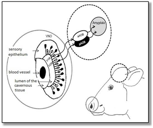 Pheromones are substances that are used in communication between individuals of the same species. The word pheromone comes from the Greek word pharein, for transmitting and hormone for arousal. Most mammals have two olfactory system, the main olfactory system and additional olfactory system. The main olfactory system involves the olfactory epithelium of the nasal cavity, the main olfactory bulb, different centers of the front part of the brain and the neurons that connect these structures (Figure 3). Vomeronasal organ and olfactory bulb make additional extra olfactory system together with their nuclei and neurons in the forebrain.2