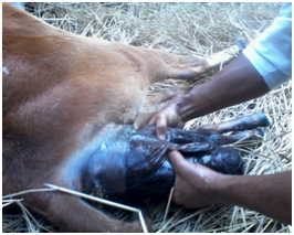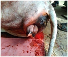 Before handling the reproductive cases particularly dystocia position of the fetus in the birth canal of the animal was determined. Rope, hook, snare, distortion pit etc. were used for manual removal of fetus. Cases were corrected as per approved methods.12,13