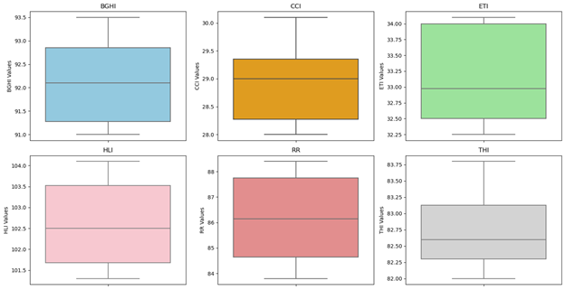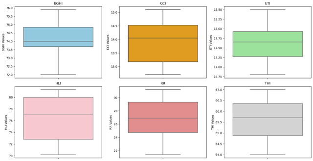 Investigating the seasonal trend of comfort indices (THI, RR, BGHI, HLI, CCI, ETI) for the study period (2000-2019): In present study the comfort indices BGHI, HLI, THI, CCI, RR, ETI were calculated for cattle. By referring the equations in Table 1, CI were calculated for all the months from 2000-2019. Further, summer (May-October) and winter (November-April) season mean (Eqn. 1) and standard error (Eqn. 2) were calculated in MS Excel. Further, the distribution of comfort indices were plotted by using boxplot in R statistical software. The seasonal trend were delineated with the respective comfort index’s threshold value (Tables 2–4).