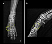 A four-months-old, female, crossbreed dog was presented with complains of acute pain and lameness of the left forelimb after jumping from a height and landing on its’ front legs. The owner reported that the injury had occurred just 30-minutes before presentation. On presentation the dog was bright, alert and responsive but painful. The general clinical examination was unremarkable apart from increased heart rate of 170beats per minute (ref. 65–140) and increased respiratory rate of 45breaths per minute (ref. 10–35), findings that were deemed consistent with the presence of underlying acute pain. The orthopaedic examination of the right forelimb was unremarkable. Examination of the left forelimb revealed acute pain with a score of 24 at the Glasgow Short Form Composite Measure Pain Scale (CMPS-SF),1 and gait assessment revealed non-weight bearing lameness of 10/10,2 with concurrent non-reducible swelling of the distal antebrachium and carpus that extended to and included the metacarpal region. There was also presence of moderate crepitus at the metacarpals and distal limb valgus. No neurological or proprioceptive deficits were observed during neurological examination. The left scapula, humerus, elbow and proximal antebrachium were evaluated and the examination was unremarkable.