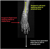Anatomical alignment was achieved more easily in this case due to the uncomplicated and minimally displaced nature of the fractures. However, even 50percent overlap of the fracture ends is considered acceptable.5 Some authors report lameness of 18-73percent after conservative or even surgical reduction of metacarpal fractures.9 The young age and simple nature of the fractures in this case possibly contributed to the positive outcome. One concern in this case was the presence of a symphysiolytic fracture on the CII, but as this digit is not weight-bearing, the effect of an early union on the gait of the animal was considered minimal.