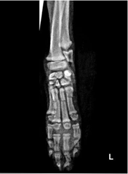 The management of metacarpal fractures can be either conservative, following a closed reduction and coaptation approach, or surgical where multiple techniques have been described including either internal or external fixation or a combination of both.6,7 To date, there is no consensus in the veterinary literature on which approach should be preferred.3 but general considerations when deciding the approach include the age of the animal, the type of the fractures, the extend of the bone and soft tissue damage, whether the fractures are open or closed, the presence of infection in old fractures and the concurrent presence of fractures in neighbouring bones.3‒6 In this case the closed reduction and coaptation technique was elected, as described by various authors for single or dual metacarpal fractures.4‒8 but modified due to fractures present on all metacarpals (Figure 1). The animal was placed on Sternal recumbency under deep anaesthesia. An Allis tissue forceps was placed on the nail of the 2nd digit and one on the nail of the 4th digit and the ends of the forceps were tied to a steady point on the wall via a traction rope in order to achieve better distribution of the traction force on all digits, whilst making certain that the limb and rope are on a straight line and exactly parallel to the table surface. Gentle and steady distal-to-proximal traction was applied on the limb with the surgeon’s left hand placed right proximally to the carpus while the right hand applied lateral-to-medial pressure on the metacarpal area in order to achieve axonal alignment. Under traction, a modified Robert-Jones splint was applied to provide stabilization. Postoperative radiographs showed good fracture reduction and alignment (Photo 2). Very strict rest was advised for 7days postoperatively and pain management was continued at home with carprofen at 4mg/kg orally once daily for 18 days. Gradual increase in exercise was advised after day 7 to encourage use of the limb and assist fracture healing. The splint was inspected on the 3rd and 12th day postoperatively for any signs of dressing complications such as vascular compromise of the limb or pressure-dermatitis, with no signs of complications. Conscious radiographs taken 18days postoperatively (Photo 3) revealed healing of the fractures and the animal was confident in using the limb with no indication of lameness. The splint was removed at day 20 and a small course of physiotherapy was followed for 2weeks due to moderate postoperative muscle atrophy. Follow-ups at 6 weeks and 3months after reduction, confirmed full recovery and return to normal activity.