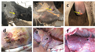 Figure 1 Gross picture of LSD infected calves showing multiple circular skin nodules of variable sizes in neck in cattle calves (yellow arrows) (a), in face around eyes eyelids (yellow arrows) (b) and on scrotum (yellow arrows) (c) in buffalo calves. Gross picture showing subcutaneous areas of congestion and fibrosis (black arrows) (d), chronic interstitial pneumonia with presence of circular to oval grey nodules (black arrow) (e), fibrinous pleurisy (black arrow) (f) in necropsied recently dead calves.