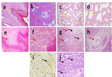 Figure 2 Histopathological analysis of H&E stained skin slides from LSD showing hyperkeratosis, epidermal acanthosis, hydropic to severe ballooning degeneration, eosinophilic intracytoplasmic inclusion bodies (yellow arrows) (a), dermal mononuclear cell infiltration (yellow arrow) and vasculitis (blue arrow) (b). Histopathological analysis of H&E stained lung slides from LSD shows non-suppurative interstitial pneumonia characterized by thickening of interstitial tissue with mononuclear cells infiltration (yellow arrows) (c&d). Well demarcated necrotizing areas are seen in lung tissue (red arrows) (e&f). Histopathological analysis of H&E stained lymph node slides from LSD shows lymphoid hyperplasia (black arrows), marked congestion (red arrows) (g) and perivascular oedema (yellow arrow) (h). IHC using monoclonal antibodies against Neethling virus revealed positive brown staining in epidermal cells, dermal elements (i) and in lymphocytes in superficial lymph nodes (j) X:40 (a,b,c,e,g); X:100 (d,f,h,i); X:400 (j).