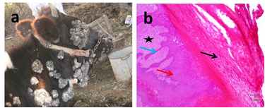 Figure 4 Gross pictures of generalized skin papillomatosis on calves (a). Histopatholgical examination of warts revealed hyperkeratosis (black arrow) acanthosis (red arrow), elongated rete-pegs (blue arrow) with fibrous stroma (asterisk) (b). X:40.