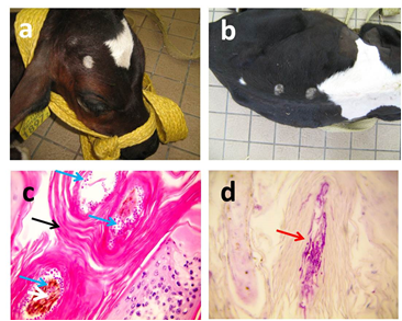 Figure 5 Gross pictures of ring worm in calves appeared as circular areas of alopecia in face (a) and back (b) of the animal. Histopatholgical examination of H&E stained skin biopsies shows hyperkeratosis (black arrow) with presence of small round basophilic bodies (ectothrix arthrospores) inside hair follicles around damaged hair shaft (blue arrows) (c). Eosinophilic septated hyphae (red arrow) appear in PAS stained slides (d). X:400.