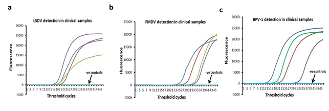 Ct values of extracted nucleic acids showed positive amplification signals for LSDV (Figure 6a), FMDV (Figure 6b) and BPV-1 (Figure 6c) were conducted in clinically collected samples from diseased animals. Non template control and negative controls did not show any amplification results.
