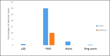 Four infectious skin diseases were detected in 2220 examined bovine calves out from 5000 (44.4%) including: LSD in 45 cattle calves (0.9%) and 5 buffaloes calves (0.1%), FMD in 1500 cattle calves (30%) and 500 buffalo's calves (10%), warts in 150 cattle calves (3%) and ring worm in 20 cattle calves (0.4%) as shown in (Graph 1).